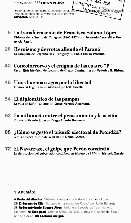 2007 vol. 37; n. 478; mayo (Sumario HTML) 28 False http://www.todoeshistoria.com.ar/ Se abre en ventana nueva: 2007 vol. 37; n. 478; mayo (Sumario HTML) Default True