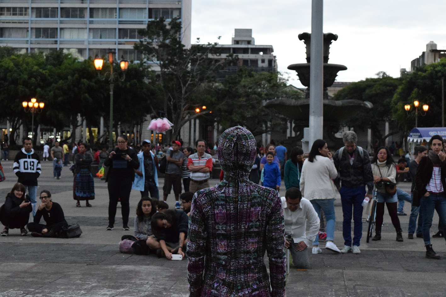 La performance trata principalmente sobre el reconocimiento y la dignificación de mis orígenes maya k´iche´s. Propone un encuentro hacia la identidad desde la piel de mi cuerpo y el tejido indígena (corte “falda” jaspeado) de mi madre, el cual lo re-significo adaptándolo a mi cuerpo. Posee energía, resistencias, recuerdos, heridas, memoria: una historia.―Manuel Tzoc
