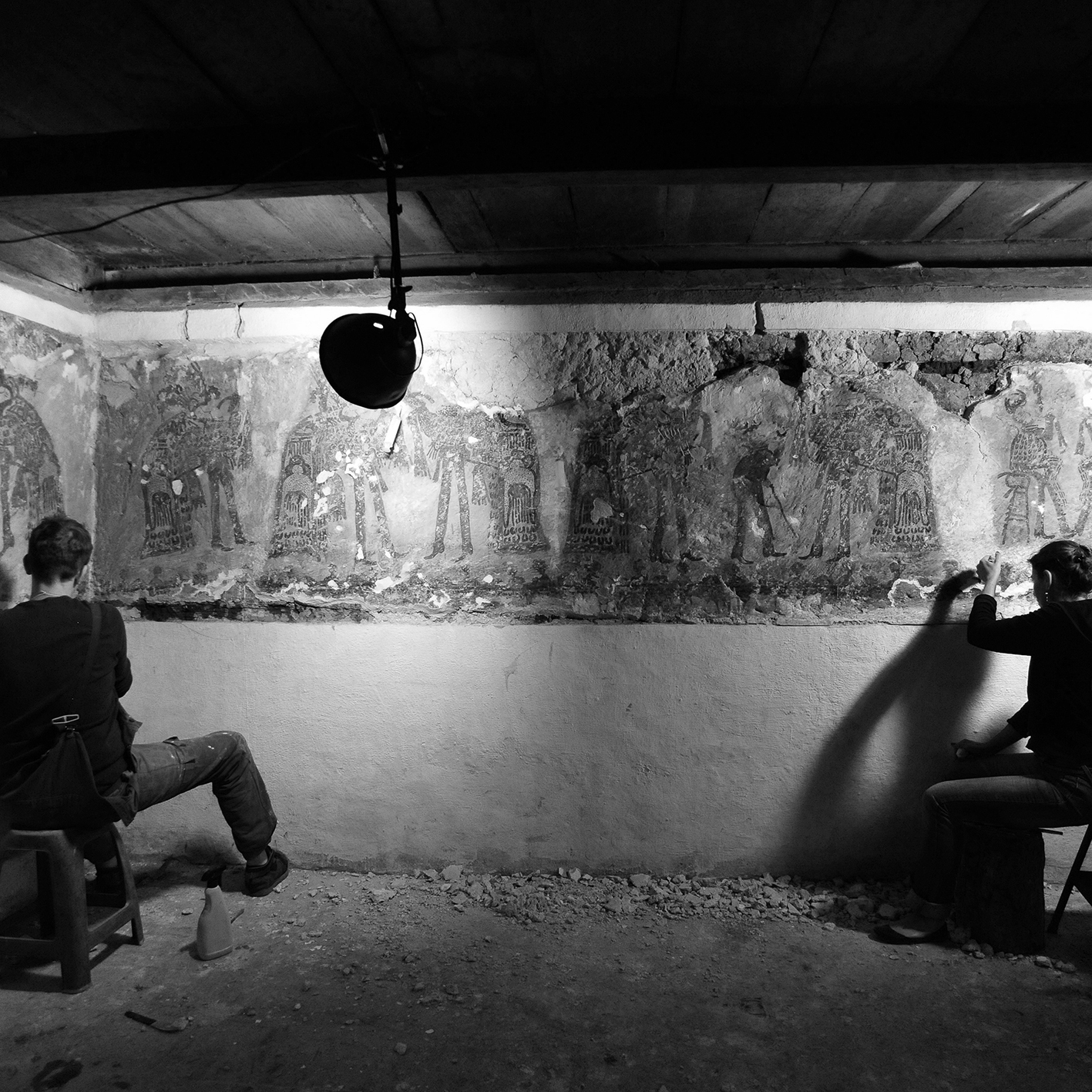Cofradías Maya Ixil, Guatemala. 2011-. Murales de Chajul. Proyecto interdisciplinario de conservación y documentación de los murales de finales del siglo XVII y principios del siglo XIX. Fotografías impresas y texto sobre pared. Fotografias de documentación de los murales originales ubicados en Chajul, Quiché, Guatemala, encontrados en la casa de la Familia Asicona. Carboncillo, pintura de óxido y azul Maya sobre mortero o repello sobre pared. Dimensiones variables. Junto con Casa de la familia Asicona. Fondo de Helena Zaleski y la Fundación Ayuda al Pasado (Pomóc Przeszłości”), Universidad Jaguelónica de Polonia, Centro Nacional de Ciencia de la República de Polonia, documentación etnográfica y excavación arqueológica. Participantes, arqueólogos, antropólogos, cofrades, integrantes de la familia Asicona.