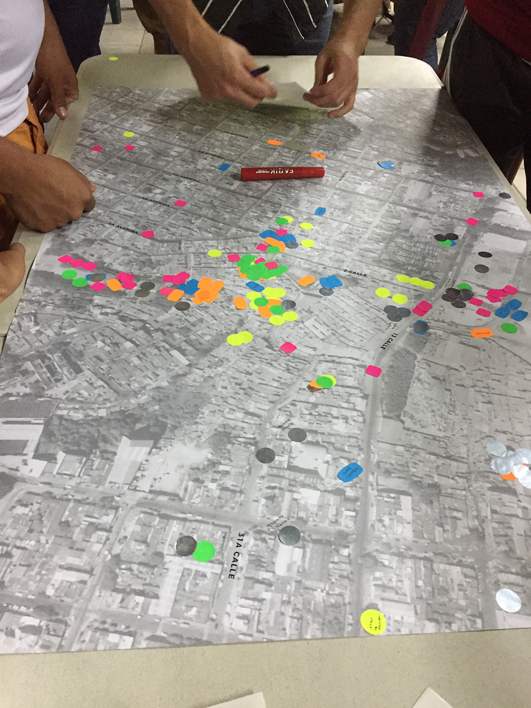 Taller ACA. 2018-. Centro Comunitario. Proyecto en proceso. Diseño arquitectónico participativo entre niños y adultos de la comunidad en conjunto con la Asociación Plantando Semillas y Taller ACA. Fotos de Talleres, mapas, textos informativos sobre el proceso de diseño, planos, dibujos y gráficas estadísticas sobre pared. Dimensiones variables. Junto con la Asociación Plantando Semillas, Vecinos de varias comunidades de la zona 3 de la ciudad de Guatemala alrededor del Relleno Sanitario