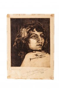 Este mes de julio, al conmemorarse un nuevo aniversario del fallecimiento de Andrés Campos Cervera —más conocido como Julián de la Herrería—, seleccionamos como pieza del mes un grabado especialmente significativo: Rêveuse (“Soñadora”), un retrato de Josefina Plá, a quien él llamaba cariñosamente Mimí. Aunque Julián de la Herrería no formó parte del Grupo Arte Nuevo, su figura fue clave en la formación artística e intelectual de Josefina Plá, quien sí sería un pilar central del grupo. Lo aprendido junto a él —tanto en técnicas como en sensibilidad estética— permeó en las búsquedas del movimiento que este año celebramos en el Centro Cultural.