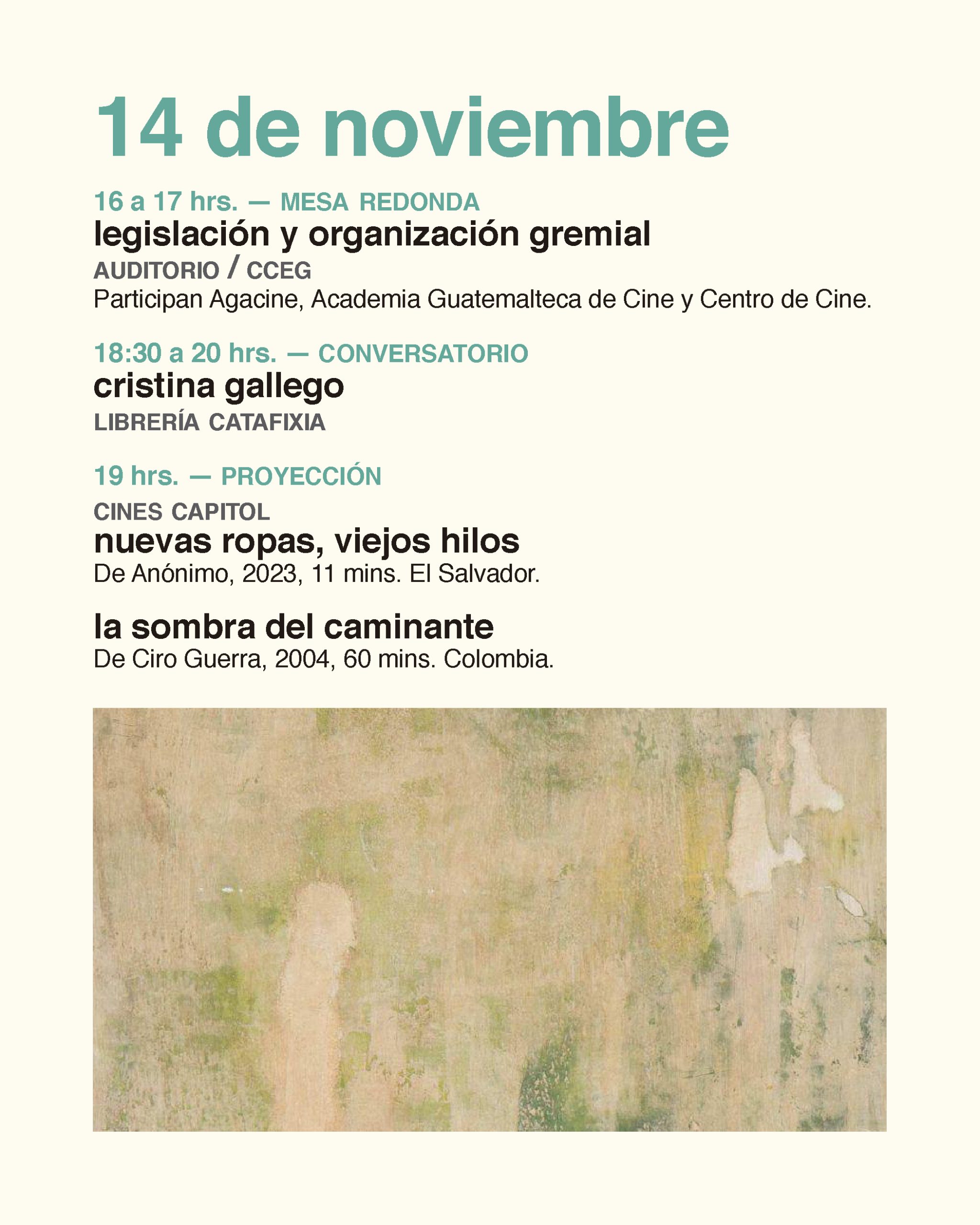 El programa de charlas y conferencias abiertas al público se desarrollará en la sede del Centro Cultural de España en Guatemala, e incluye clases magistrales y mesas redondas sobre temas como la Ley de cine, la libertad de expresión o los circuitos de exhibición. La programación se completa con un ciclo de proyecciones en los Cines Capitol con cortometrajes y largometrajes del cine contemporáneo mundial.