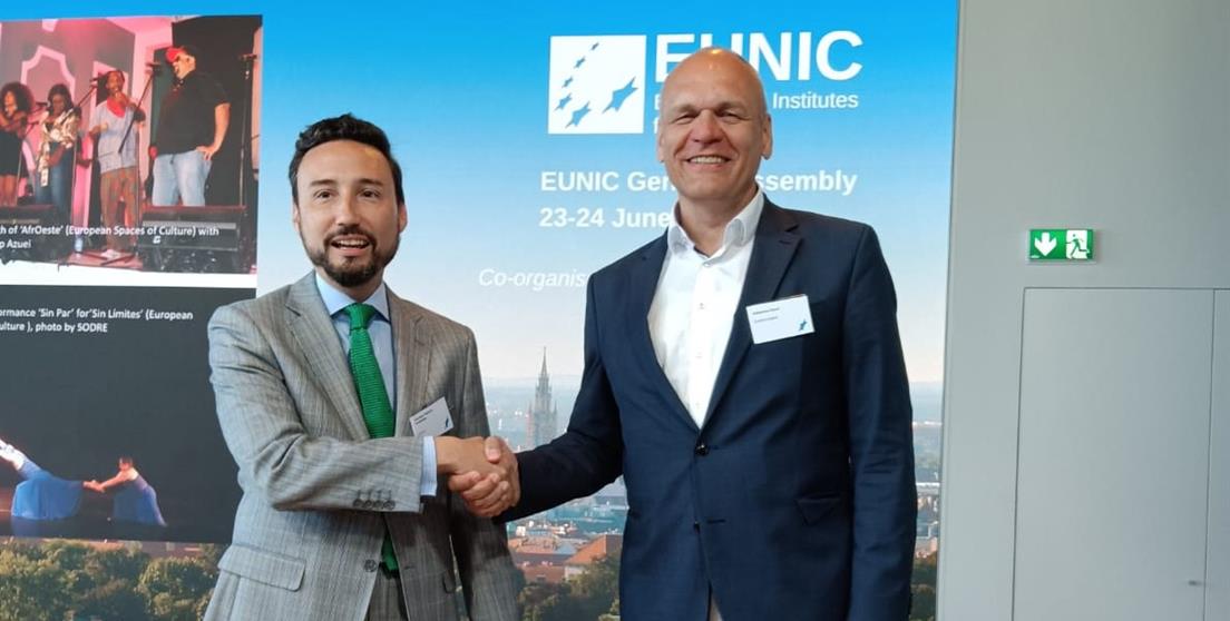El director de Relaciones Culturales y Científicas de la Agencia Española de Cooperación Internacional para el Desarrollo (AECID), Guzmán Palacios, ha trasladado hoy el relevo, como Presidente de la Red Europea de Institutos Culturales (EUNIC), al actual Vicepresidente de EUNIC y Secretario General del Goethe-Institut, Johannes Eber. Dicho traspaso se ha producido en el marco de la Asamblea General de EUNIC, celebrada estos días en la ciudad alemana de Múnich, y en la que también se ha renovado la Junta Directiva de la red y definido su plan de actuaciones.