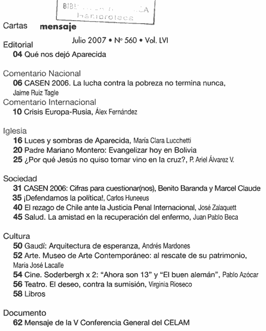 2007 vol. 56; n. 561; ago. (Sumario Imagen) 64 False /galerias/imagenes/revistas/sumarioImagen/mensaje-2007-561.gif Se abre en ventana nueva: Sumario imagen del núm. 561 de 2007. Default True