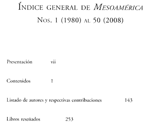 2008 Índice geneal; 1980 - 2008 (Sumario Imagen) 10 False /galerias/imagenes/revistas/sumarioImagen/mesoamerica-ind-1980-2008.gif Se abre en ventana nueva: Sumario Default True