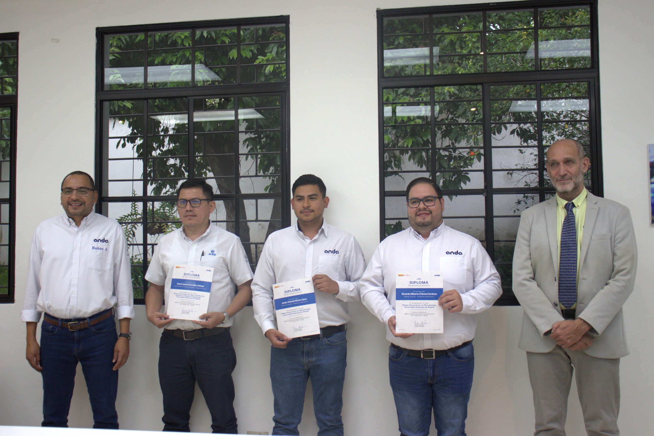 Representantes de la Agencia Española de Cooperación Internacional para el Desarrollo (AECID) y de la Administración Nacional de Acueductos y Alcantarillados (ANDA) brindaron reconocimiento a tres funcionarios de ANDA seleccionados para las Becas MAEC en la modalidad «Máster Agua», otorgada a profesionales de la gestión del ciclo urbano del agua para la realización de un máster universitario en España.
