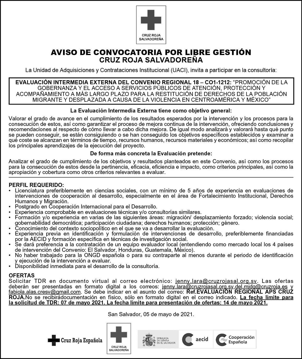 Title of the announcement: ONGD_Consultoría para evaluación intermedia externa del convenio regional 18-CO1-1212_ CruzRoja